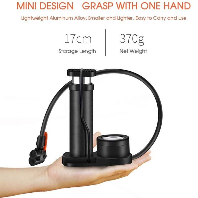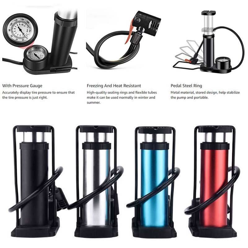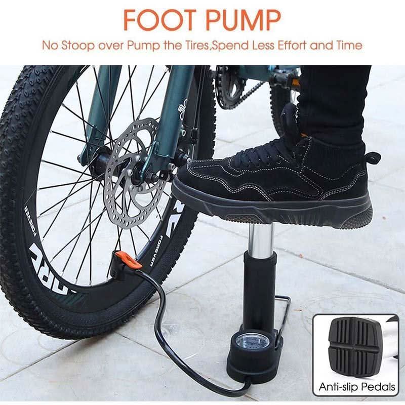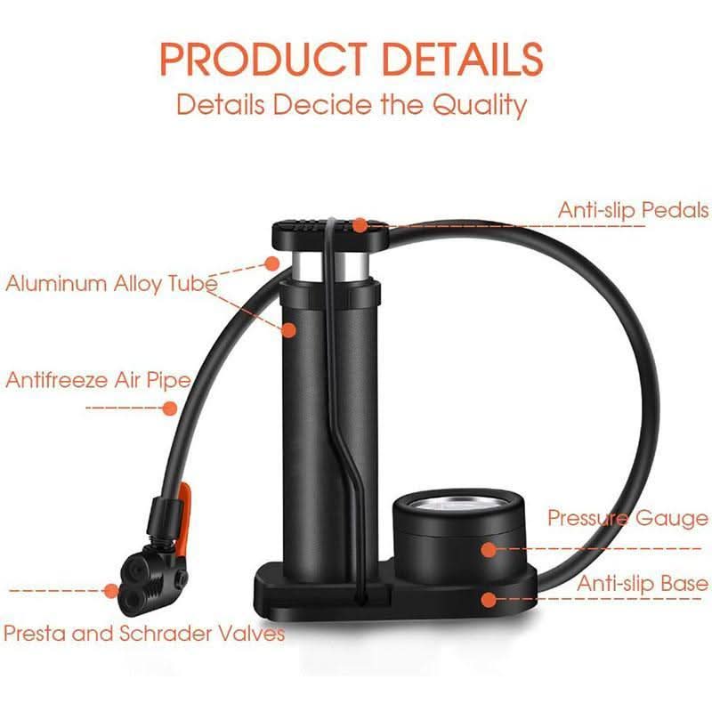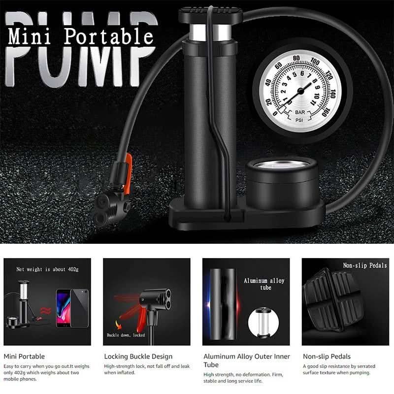 【Compact and Foldable】The bike pump has a compact and foldable design, and the built-in pedal safety locks keep the body stable and will not suddenly bounce out. Perfect for travel or home use, easy to carry!