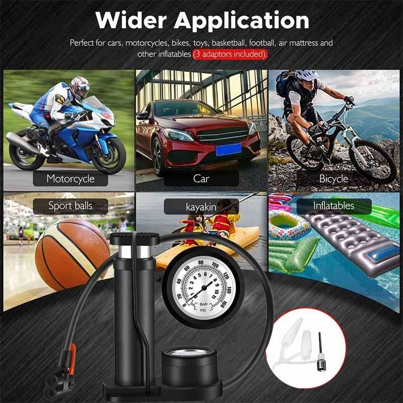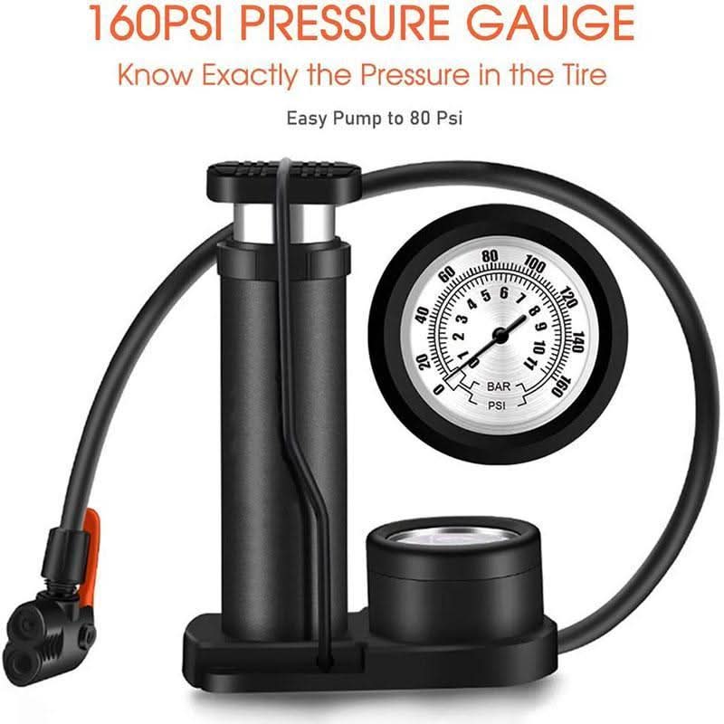 160 PSI portable bike pump with accurate pressure gauge and smart valves, air pump for bikes, motorcycles, cars, balls, and other inflatable products.