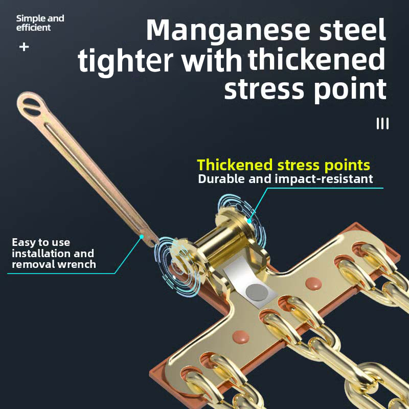 SUPERIOR TRACTION-PERFORMANCE - Manganese steel construction provides exceptional traction on slippery surfaces. The robust chain links form a diamond-pattern grip, distributing pressure evenly to maximize contact with ice and snow, significantly reducing skidding and enhancing vehicle control. This design ensures reliable performance in challenging winter conditions, allowing for safer navigation.