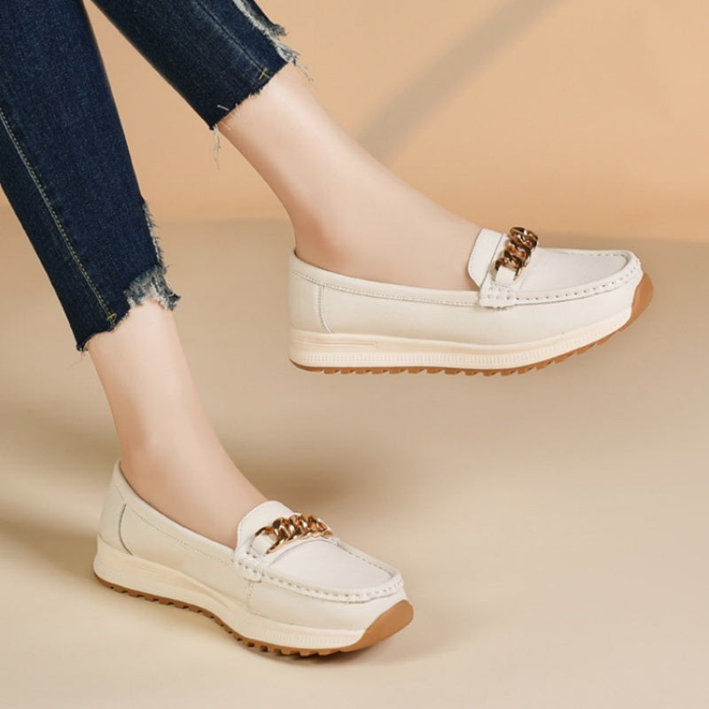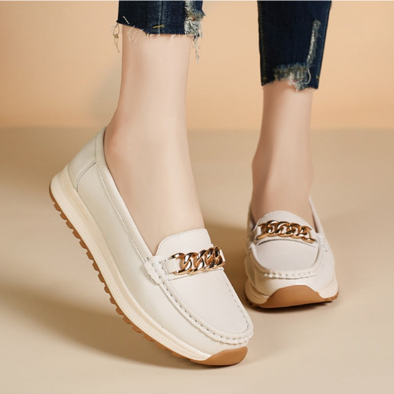 SLEEK SOLID COLOR WITH GOLD CHAIN DETAIL - Featuring a timeless solid color palette complemented by a subtle gold chain accent, these loafers add a touch of elegance to any outfit.
